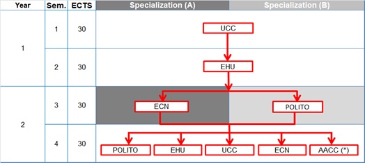 Students will spend their 1st semester in UCC (30 ECTS), the 2nd semester in UPV/EHU (30 ECTS) and the 3rd semester in ECN or POLITO (30 ECTS). The 4th semester will be devoted to the student’s Master thesis, hosted by any of the above mentioned universities or in the associate centers collaborating in this master.